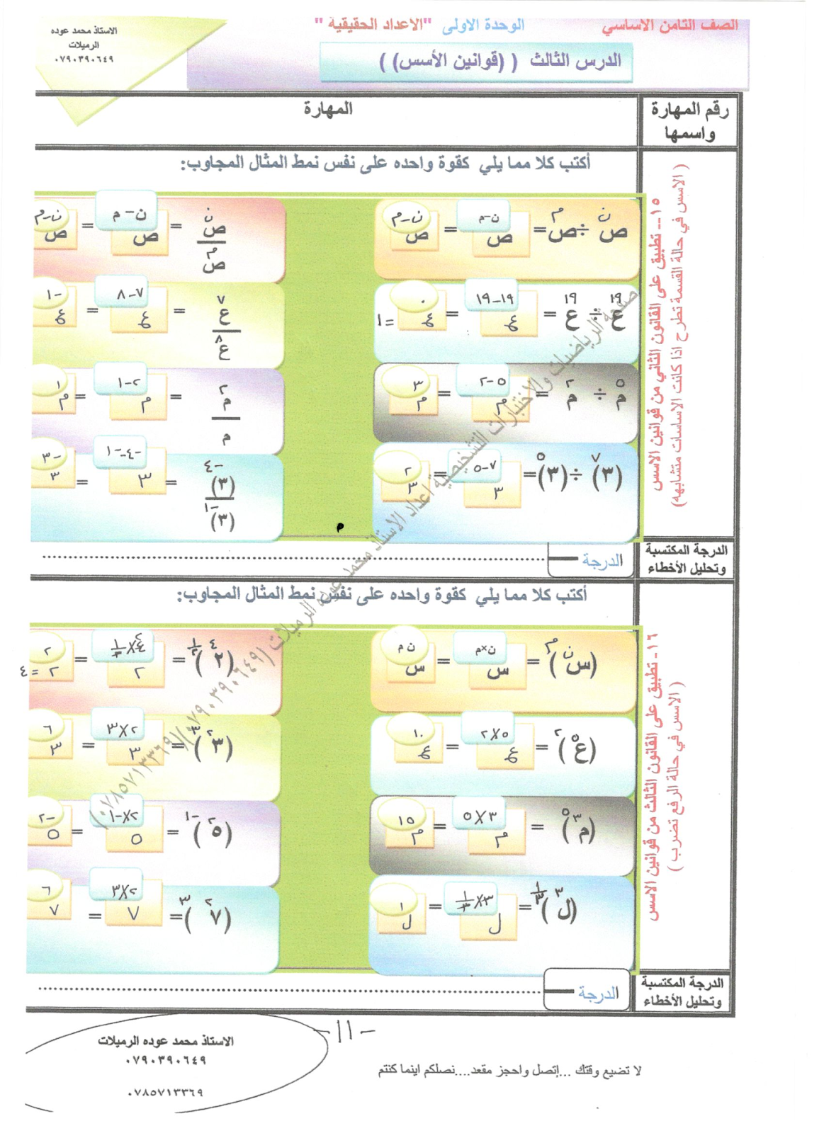قوانين الاسس للصف الثامن الاساسي من الوحده الاولى